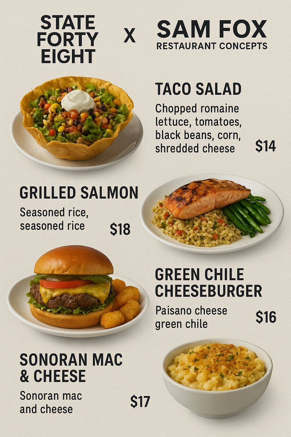 “State Forty Eight x Fox Restaurant Concepts” mock menu items